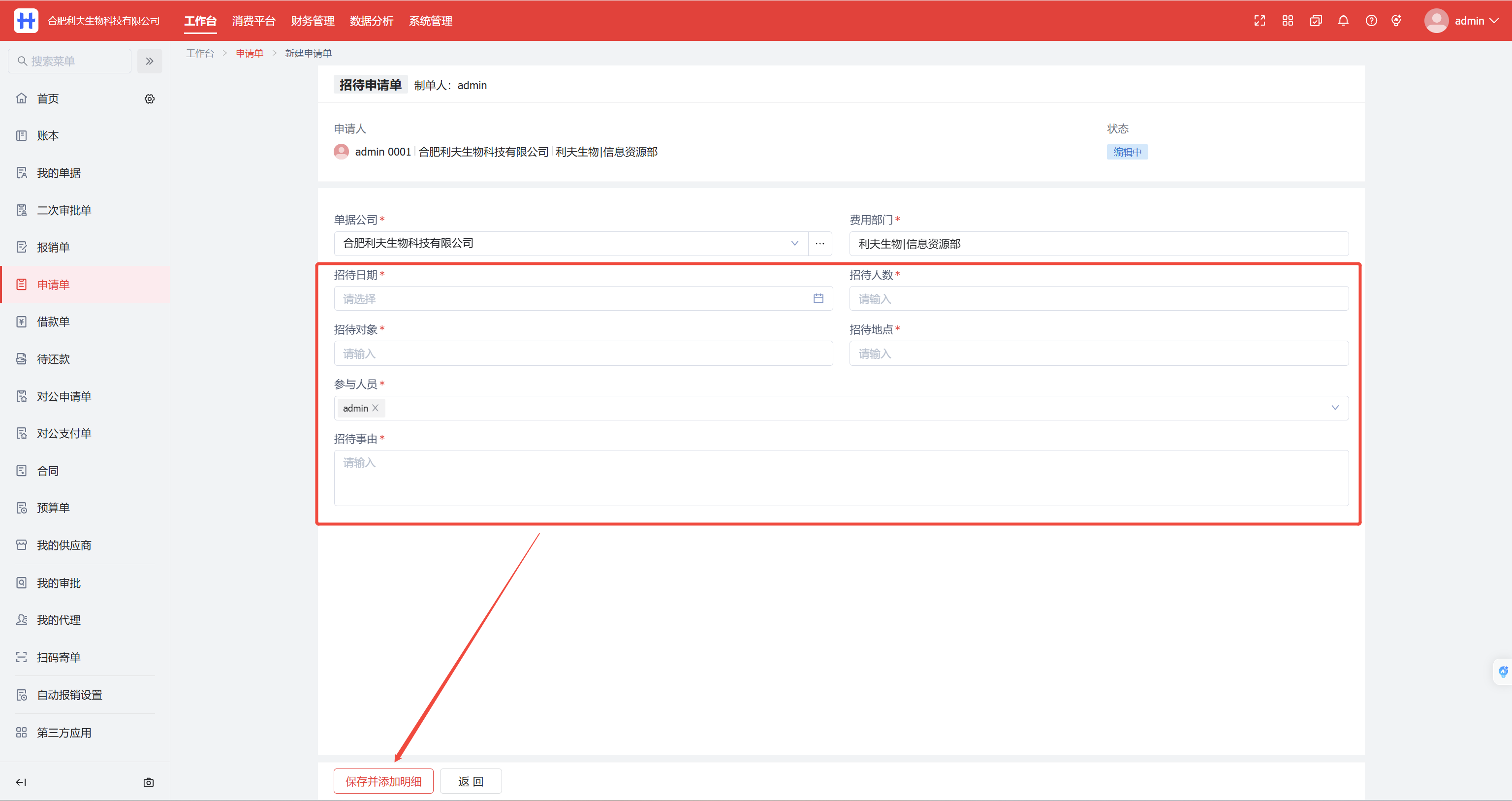 工作台>申请单>招待申请单