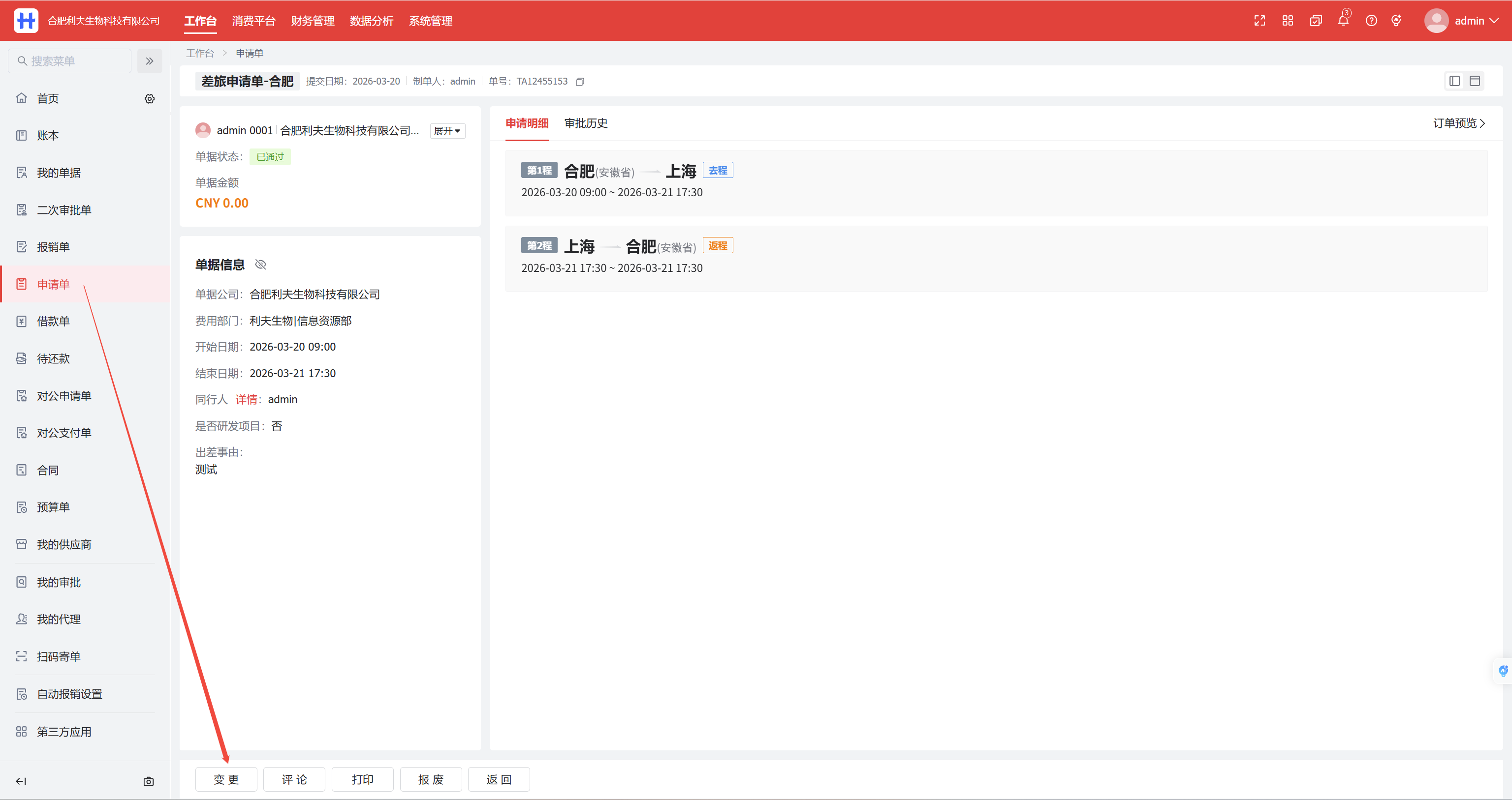 差旅申请单通过审批后,会自动同步考勤到HR系统,若需修改行程或其他信息,需进行变更,申请变更后,将同步新的考勤信息到HR系统。