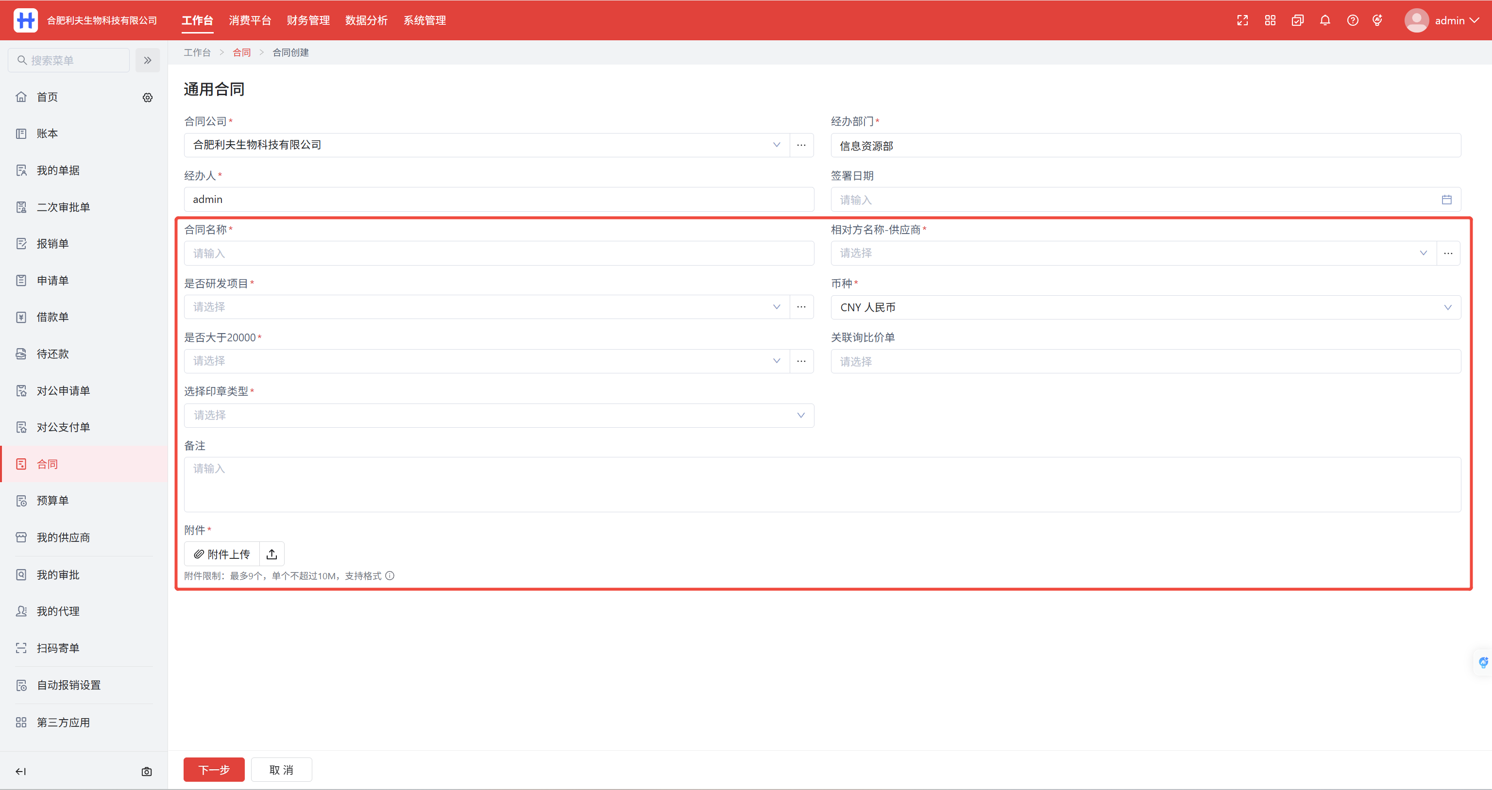 步骤一:填写通用合同基础信息,点击下一步