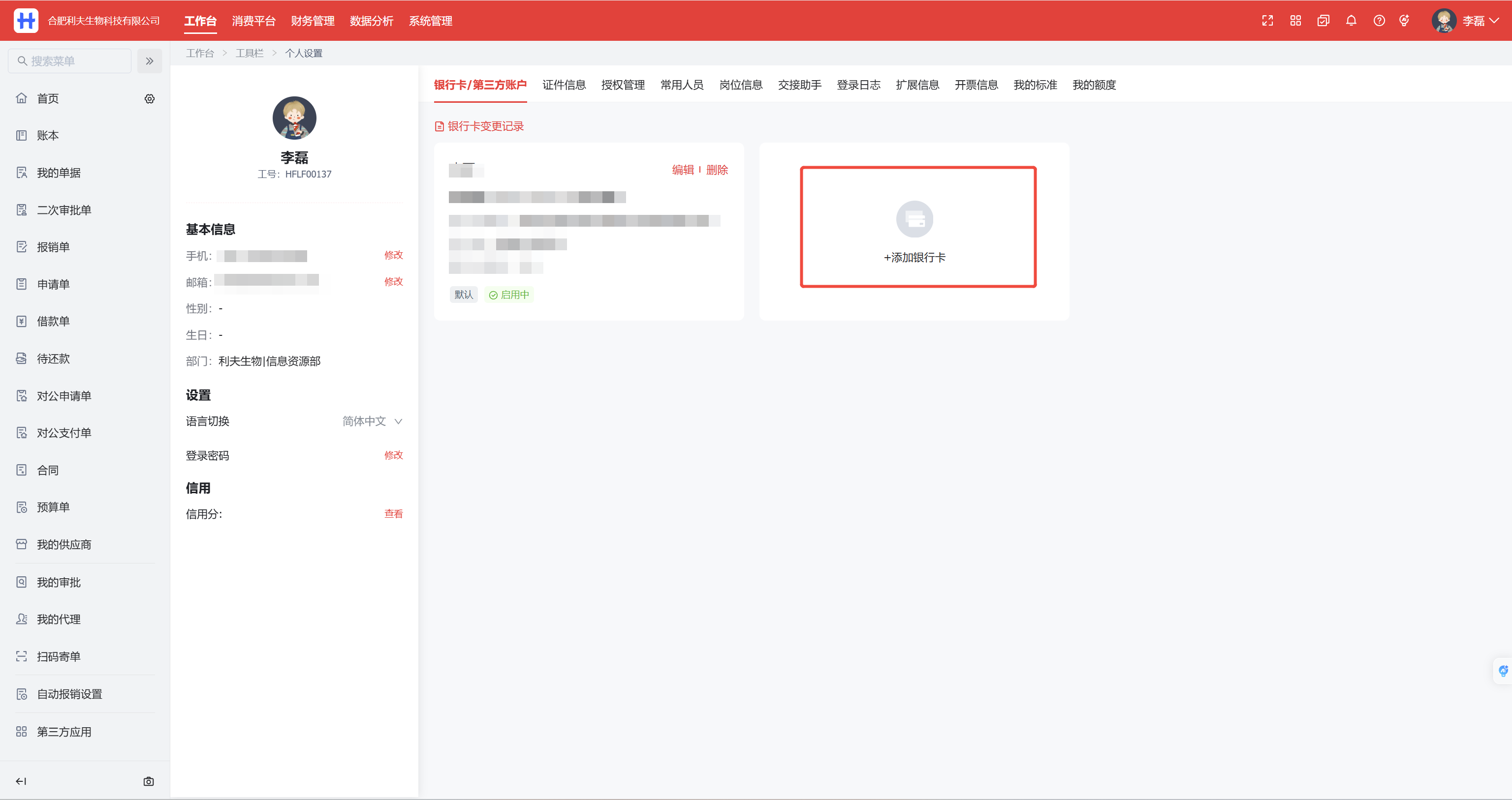 步骤一:填写报销单前,需先确认是否已在个人设置中添加银行卡信息